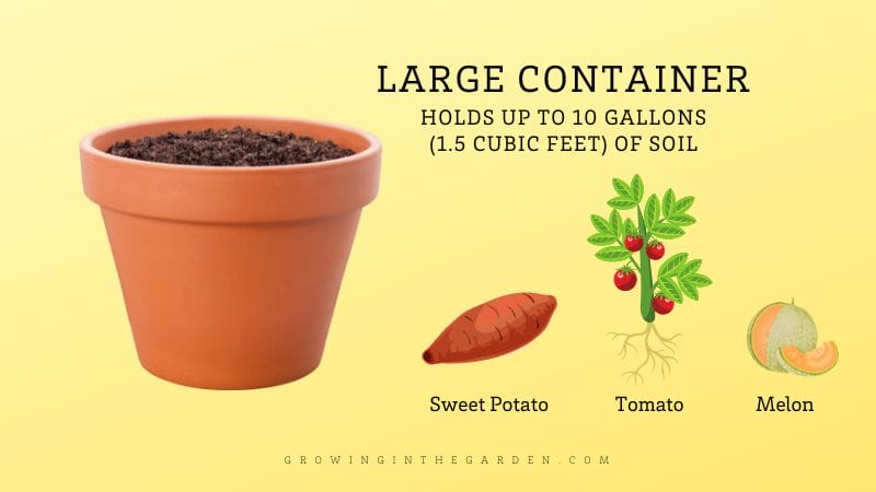 Plants that grow well in large containers include: sweet potatoes, tomatoes, cantaloupe, watermelon