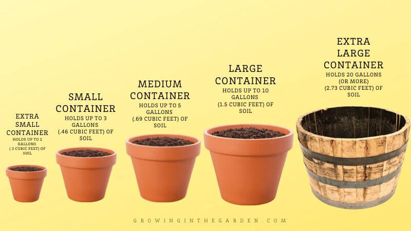 Examples of extra large containers include: 18″ terra cotta pots (2.3 cubic feet of soil), 24″ terra cotta pots (3.8 cubic feet of soil), 20-gallon grow bags, and half wine barrels (4.3 cubic feet of soil)