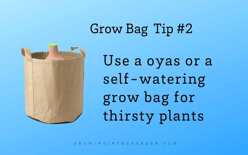 - For thirsty plants like tomatoes and squash, use a grow bag with a watering reservoir or add an olla to the grow bag.