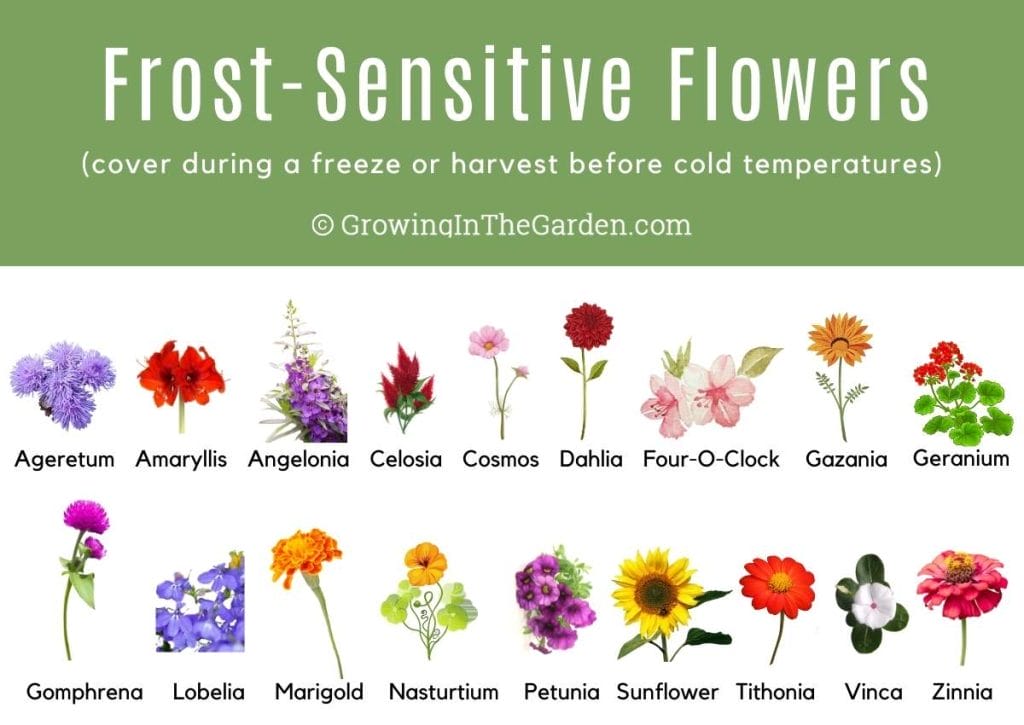 Frost-tender flowers include (but are not limited to) ageratum, amaryllis, angelonia, begonia, calla lily, canna, celosia, coleus, cosmos, dahlia, four-o-clock, freesia, gazania, geranium, gomphrena, impatiens, lobelia, marigold, nasturtium, petunia, purslane, sunflower, tithonia, toothache plant, verbena, vinca, and zinnia.