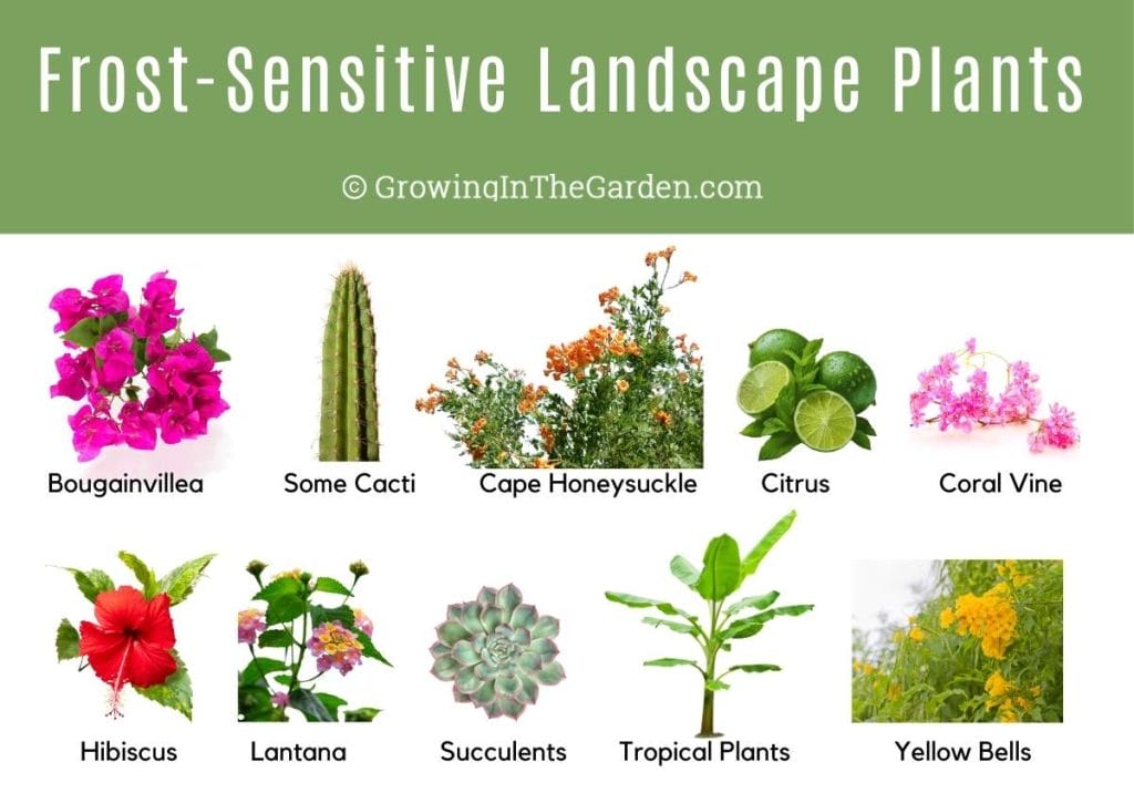 Frost-tender landscape plants include (but are not limited to) bougainvillea, some cacti, cape honeysuckle, coral vine, ficus, hibiscus, lantana, natal plum, myoporum, pygmy date palms, succulents, tropical plants (avocado, banana, guava, etc.), and yellow bells.