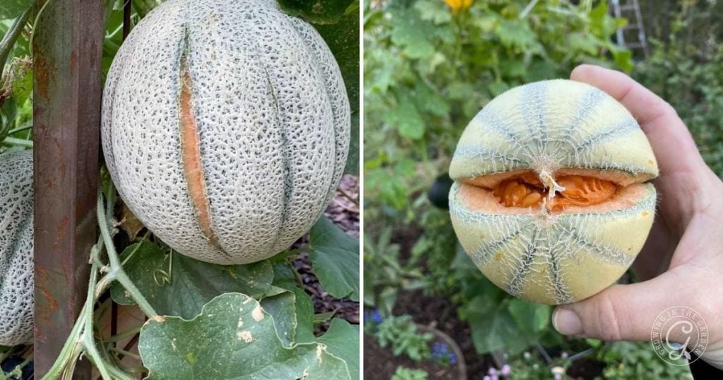 Fruit splitting is a common cantaloupe growing problem. This typically occurs when plants experience irregular or inconsistant watering, particularly after heavy rain. To mitigate this, maintain a steady watering schedule, and if a heavy rainstorm is forecasted, harvest fruits that are close to ripening to prevent splitting.