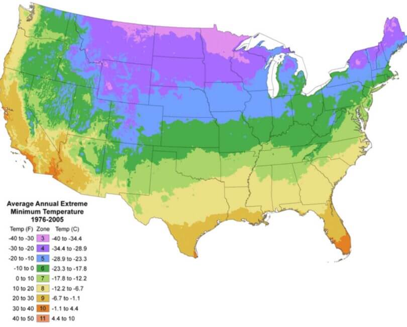 System developed as a guide for planting and gardening. The United States is divided into thirteen zones by the lowest annual temperatures. A plant’s “hardiness zone” is the lowest USDA zone it can withstand without dying during cold temperatures. See also HARDINESS ZONE.