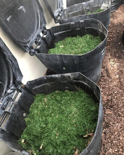 The bins need to be around 3 feet (.9 m) wide and 2 to 3 feet (.6 – .9 m) deep (smaller bins won’t heat up as well), have lids, holes drilled in the sides for airflow, and bottomless. For the method I use, you need more than one bin. For smaller yards, 2 bins work fine. Larger yards could use 3, 4, or more bins.