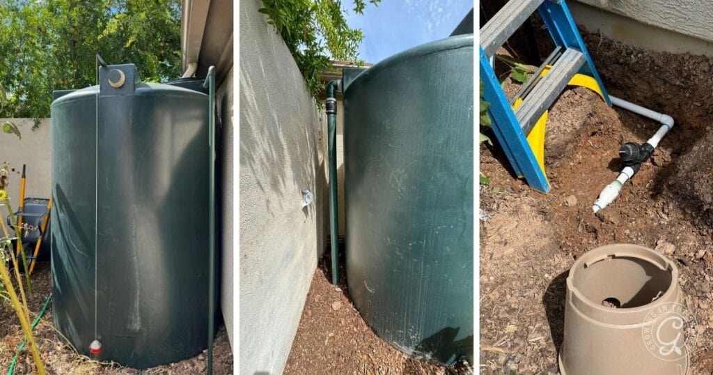 This 1100-gallon rain barrel has an internal pump and filter connected to my drip system. When water is available, I use it to water my garden and yard. Additionally, If you can access flood irrigation, learn more about using irrigation water to water your garden in this blog post.