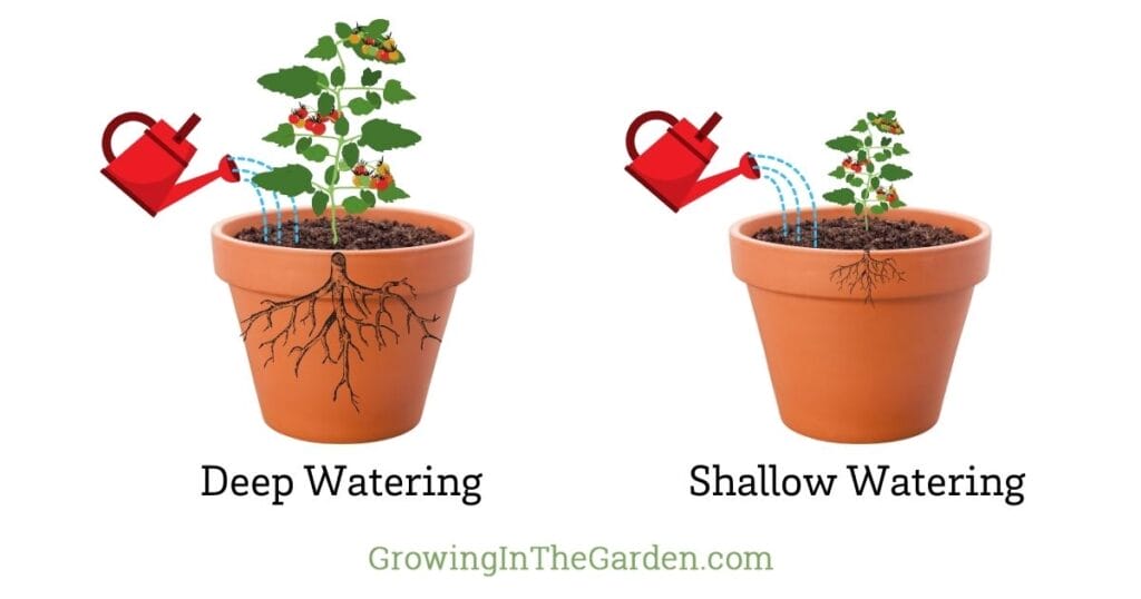 Watering plants deeply but less frequently encourages deeper root growth as the water penetrates further into the soil. This deep root growth enables plants to access moisture more effectively, reducing their dependence on frequent watering.